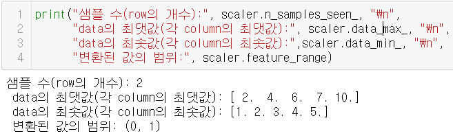 MinMaxScaler는 내부적으로 활용한 샘플의 수, 데이터의 최대/최소의 값, 변환한 값의 범위 등을 반환한다. 이를 다음과 같이 확인할 수 있다.