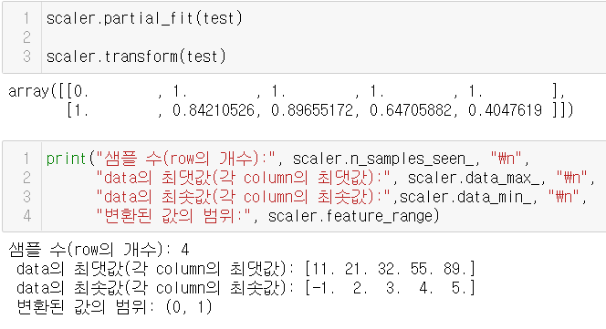 한 번 학습시킨 scaler에 대해, 다른 데이터로 추가 학습시키고 싶은 경우 partial_fit()을 이용할 수 있다. 아래와 같이 달라진 결과를 확인할 수 있다.