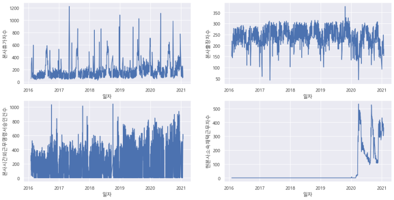 g_date2 = sns.lineplot(x=df['일자'], y=df['출장자수'], ax=ax[0][1])