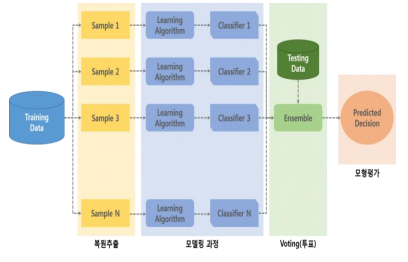 > 붓스트랩 방법론 중 하나로, 훈련용 데이터로부터 같은 크기의 표본을 여러 번 단순 반복추출을 통해 만들고, 이를 통해 학습시킨 여러 개의 모델의 결과 값을 voting을 통해 결합하여 최종 결과를 산출하는 방법