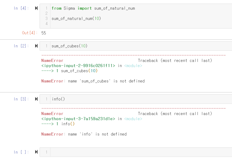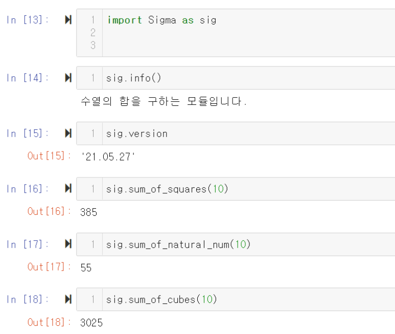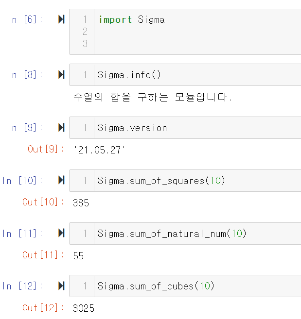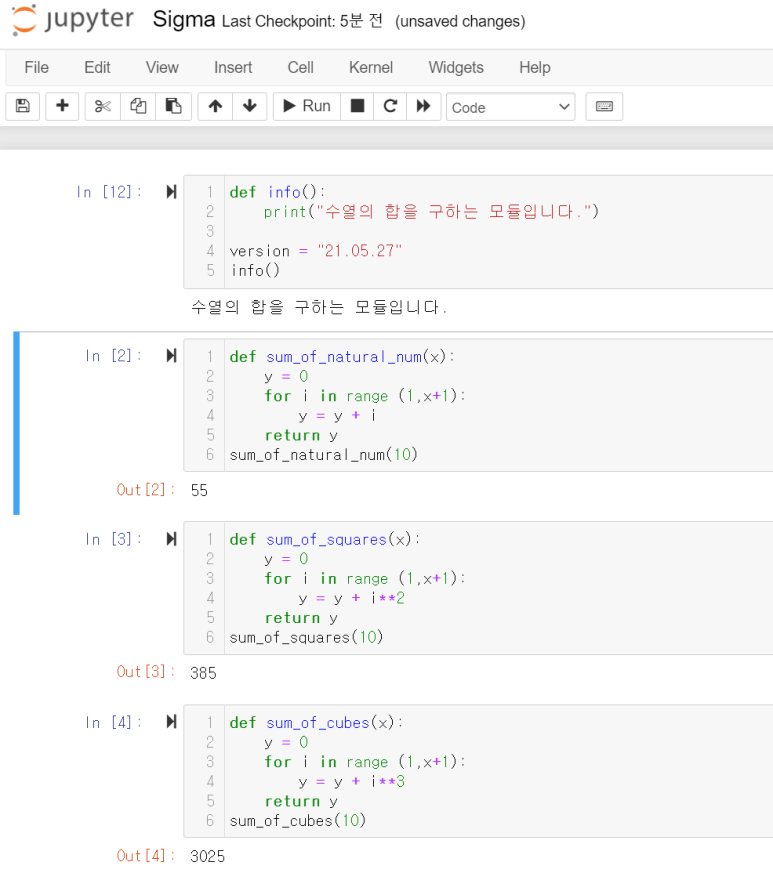 아주 허접하지만 간단한, 함수 네 개를 만들어보았다. 첫 함수는 모듈을 소개하는 말을 출력하고, version이라는 변수를 생성 날짜로 지정했다. 이어지는 세 함수는 각각 자연수와 자연수의 제곱, 세제곱의 합을 구하는 함수다.