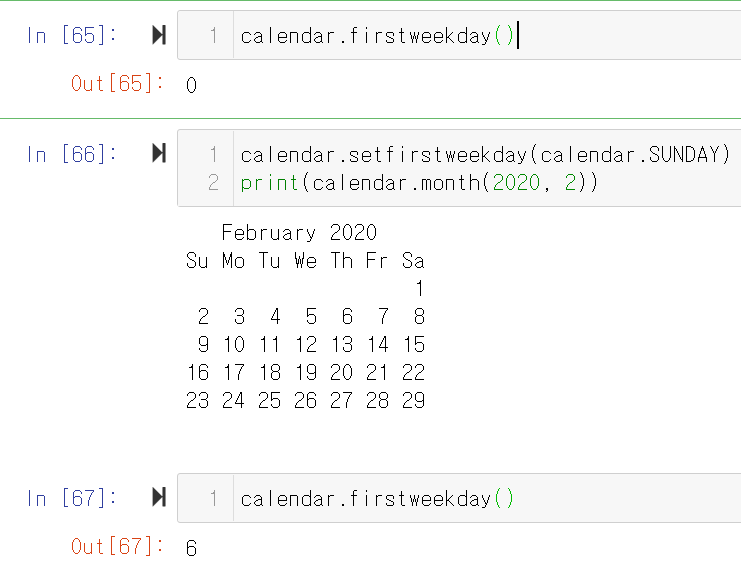 calendar.firstweekday(): 현재 달력의 시작 요일이 무슨 요일인지 확인 할 수 있다. default값은 0(월요일)이다.