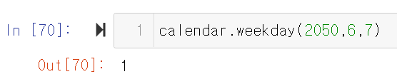 calendar.weekday(연도, 월, 일): 해당 날짜의 요일을 알려준다. 2050년 내 생일은 화요일이구나.