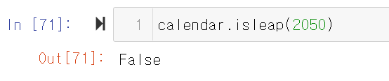 calendar.isleap(연도): 해당 연도가 윤년인지 여부를 알려준다. 윤년이면 TRUE 아니면 FALSE.