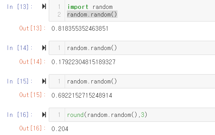 난수이기 때문에, 당연히 실행할 때마다 숫자가 바뀐다. round( 실수, n)를 통해 소수 n째자리까지만 확인할 수 있다.
