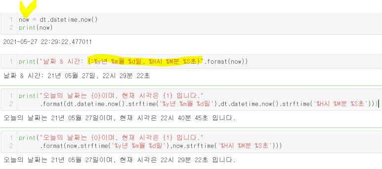 위처럼 datetime(dt).datetime.now()를 이용 현재 시각을 알 수도 있고, 아래와 같은 방법을 통해 다양하게 표현해볼 수 있다. 하이라이트 친 박스에서는 중괄호{} 안에 저 정보들을 넣어야 한다는 점, 중괄호 시작할 때 :표시, 대소문자 구분 등에 유의해야 한다.