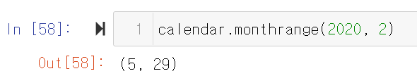 calendar.monthrange(연도, 달): 지정한 연도의 달이 어떤 요일로 시작하고, 며칠인지를 반환함.