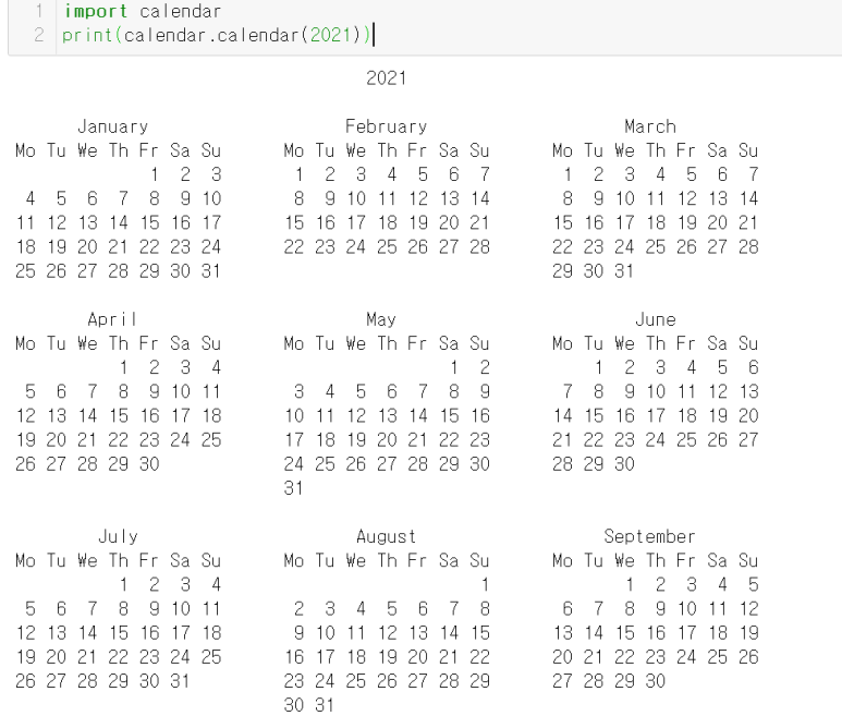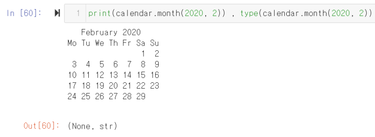 calendar.month(연도, 달): 지정한 연도의 달의 달력을 str type으로 반환