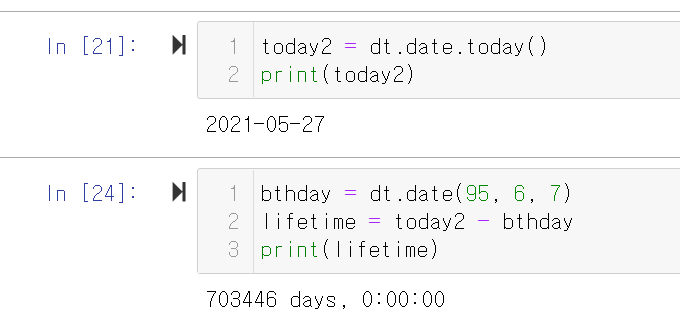 datetime(dt).date.today()를 이용해 코드 입력 당시의 날짜를 알 수도 있다. 또한 날짜 끼리의 차를 구하면 해당 날짜들 사이의 기간도 알 수 있다.