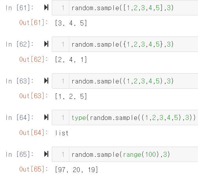 n개의 시퀀스 혹은 set에서 k개의 인자를 반환한다. 리스트, 셋, 튜플, range() 등이 모집단으로 들어갈 수 있고, 결과는 리스트로 나오며 순서의 영향을 받는다.