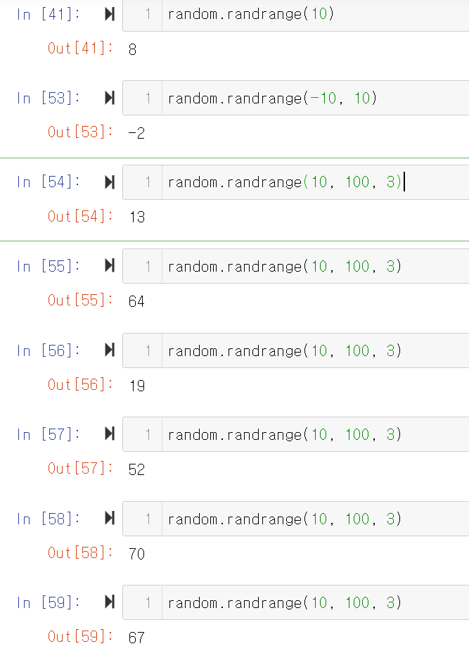 range() 함수에서의 속성과 유사하게 a가 생략되면 default 값은 a==0이고, c가 생략되면 default 값은 c==1이다. 역시 range() 함수와 마찬가지로 b는 범위에서 제외되며, step을 줄 경우 첫 정수부터 step 간격으로 있는 정수들 중 하나를 반환한다. 예시에서 시작이 10이고 step이 3이므로, 3으로 나누었을 때 나머지가 1인 숫자들만 반환되는 것을 볼 수 있다.