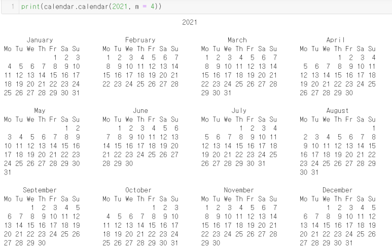 calendar.calendar(연도, m=4)로 한 줄에 4개가 나오게 할 수 있다. 입력하지 않으면 default 값은 m=3이다.