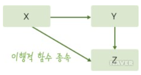 '고객아이디 + 인터넷강좌'가 복합키로서 기본키가 되고, 하위속성인 '담당강사번호'를 식별하지만, '담당강사번호'가 다시 또 다시 기본키를 구성하는 속성 중 하나인 인터넷 강좌를 식별하는 종속성이 존재한다.