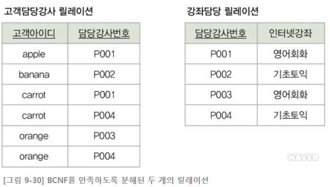 ▶ 릴레이션이 제 2차 정규형이면서 복합키인 기본키를 구성하는 속성과 하위 속성 간에 이행함수종속성이 존재하는 경우, 릴레이션의 무손실 분해를 통해 해당 이행함수종속성을 없애는 과정. 그 결과 만들어진 릴레이션을 '보이스코드 정규형(BCNF)을 만족한다' 혹은 '강한 3차 정규형을 만족한다'고 한다.